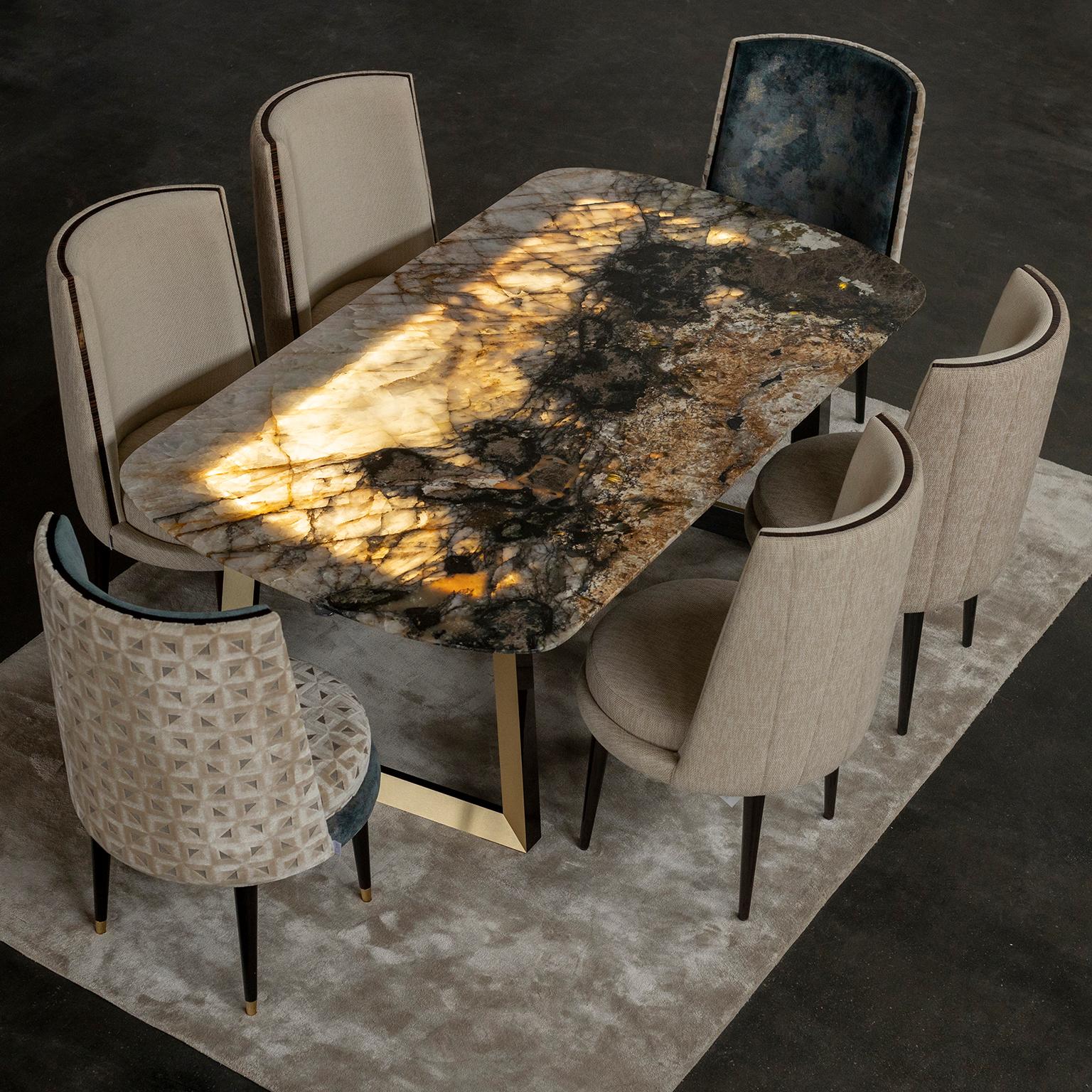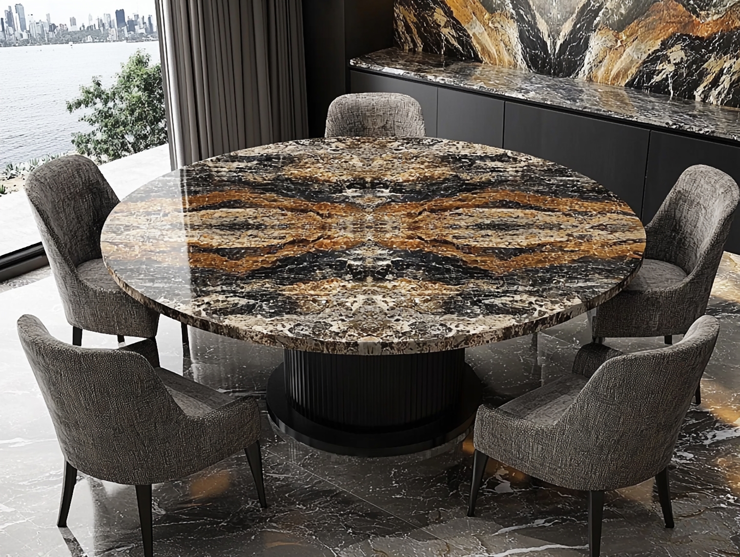 These striking surfaces are mounted on your choice of solid granite or heavy-duty wrought iron bases, combining natural durability with timeless design. Whether for patios, terraces, or garden dining areas, these furniture pieces offer a refined blend of strength and sophistication, built to retain their beauty year-round.
