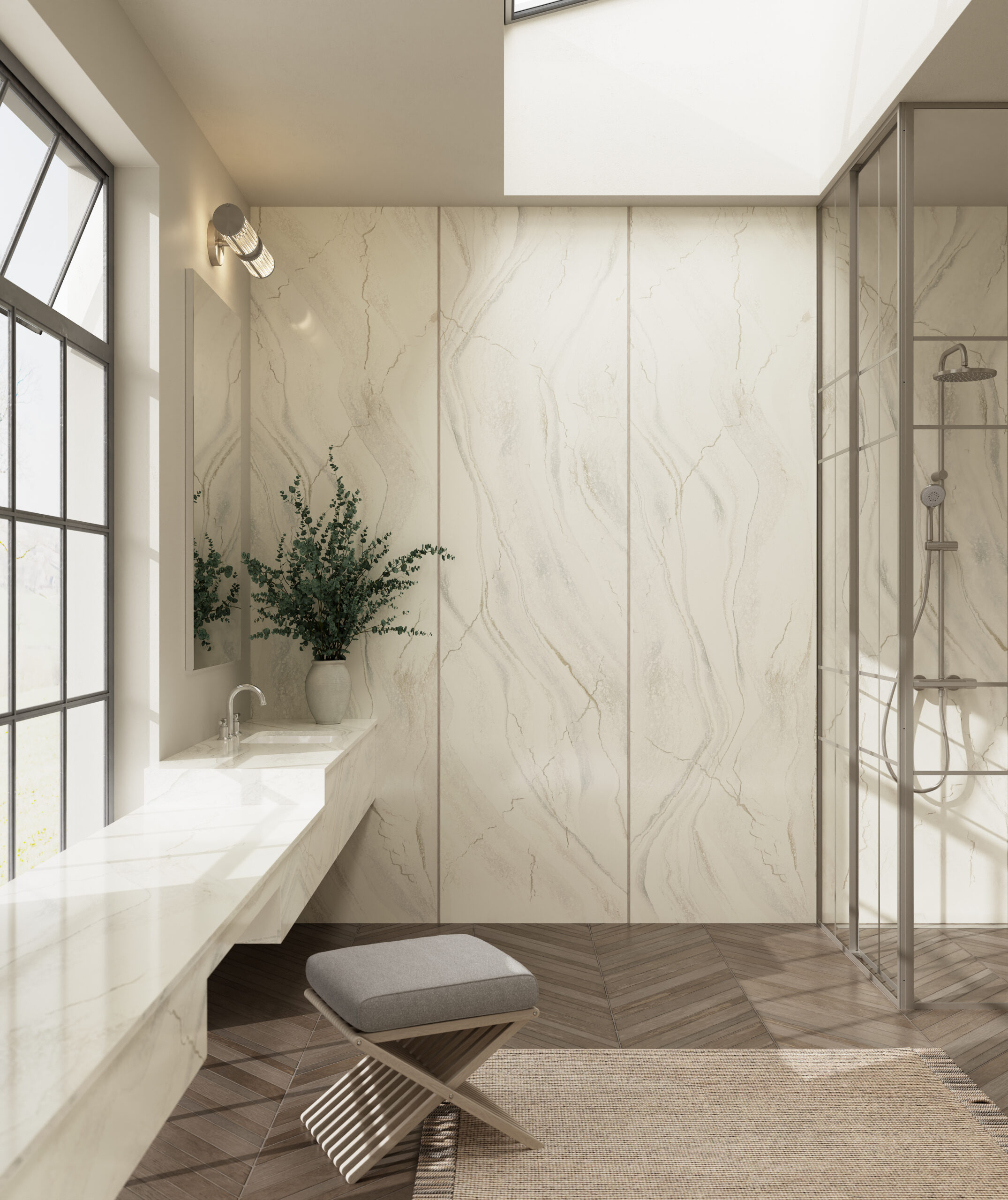 Full-height slabs (320x150cm) in digitally printed patterns—from Carrara marble illusions to metallic 3D fractals—eliminate grout lines for seamless sophistication.