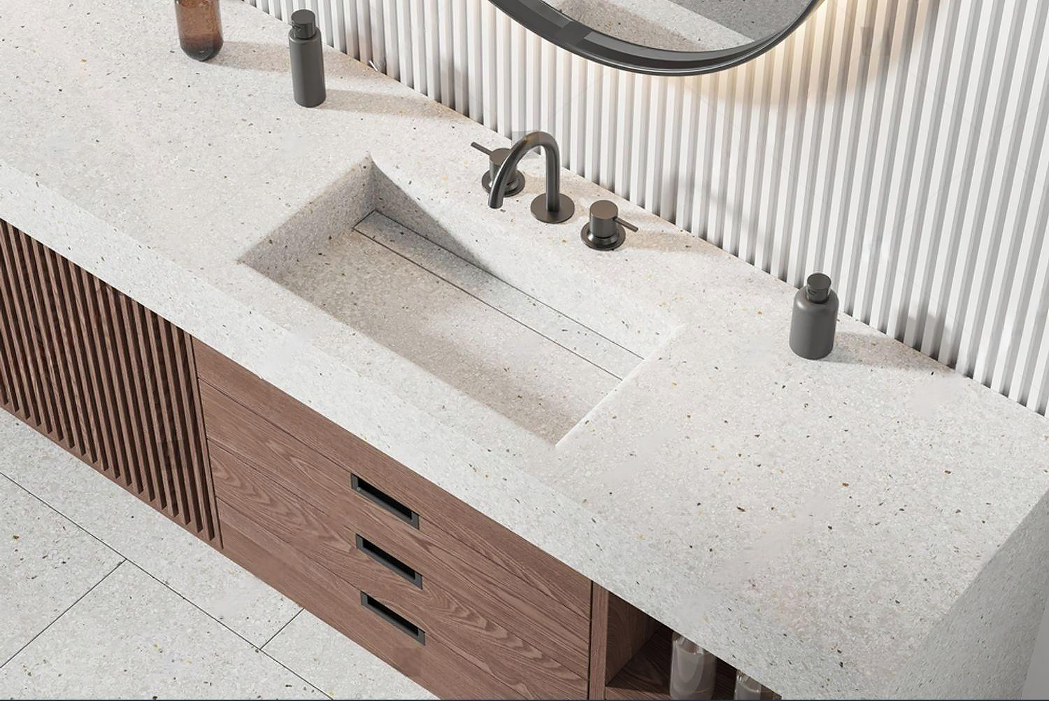 Enhance your bathroom with a refined granite vanity that seamlessly fuses sink and countertop into one minimalist piece. Naturally water-resistant and mold-repellent, its speckled stone surface adds organic warmth to modern interiors. Available in floating or wall-mounted formats, with optional integrated storage for a clean, functional upgrade tailored to both style and durability.