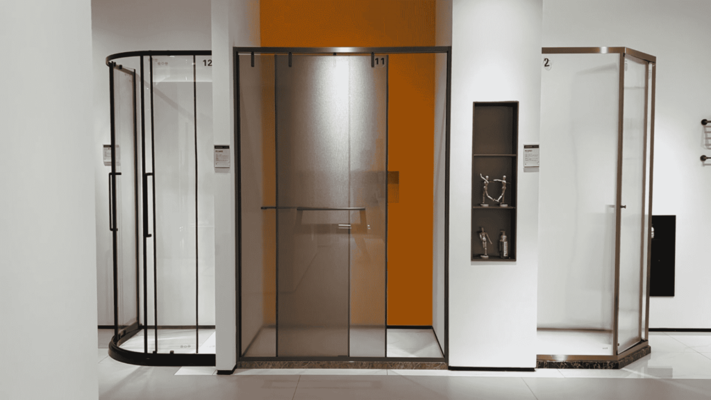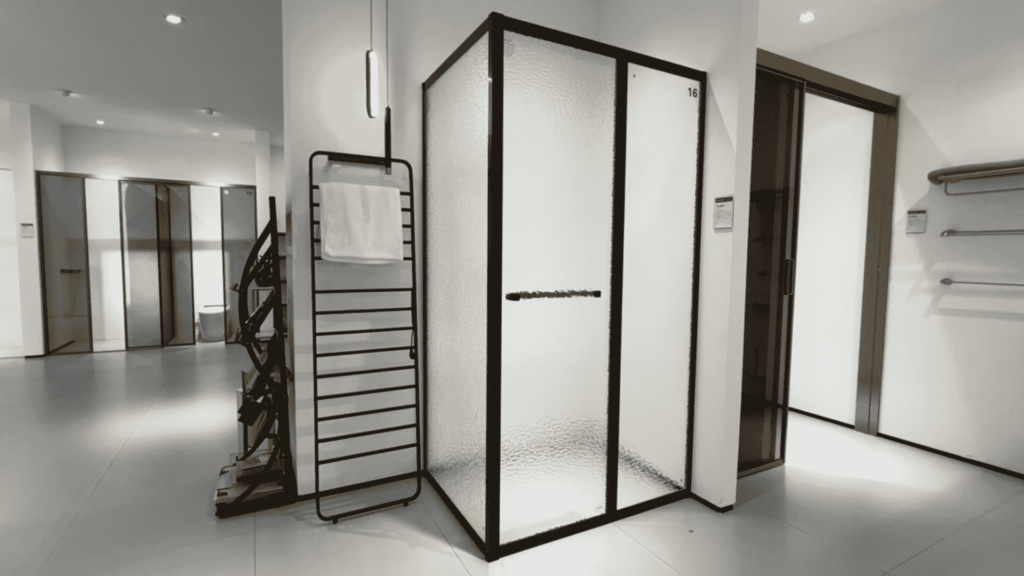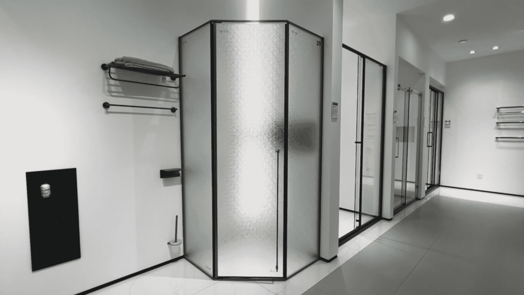 Textured Glass Shower Enclosure Display | Modern Black Frame Bathroom Design